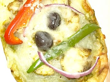 Marinara sauce, Italian herbs seasoning , red onion , black olives, bell peppers and mozzarella cheese Made with mini Naan Flatbread all served with zesty Pickles.