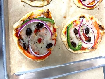 Chicken Pesto flatbread / Hot dog Marinara flatbread mini Naan topped with red onions , bell peppers, black olive and mozzarella cheese . All served with zesty Pickles.